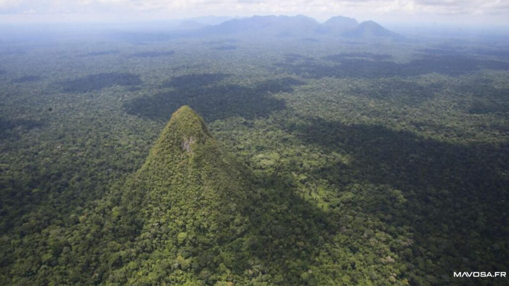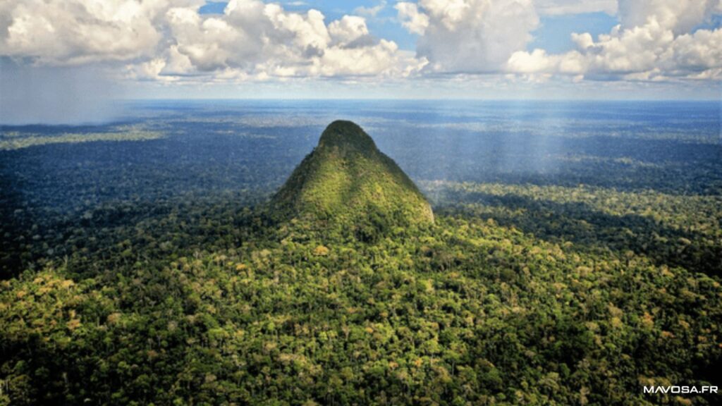 Sa forme conique, presque parfaite, avec une base circulaire et des versants réguliers, le rend visible à plus de 400 kilomètres à la ronde par temps clair, y compris depuis les contreforts des Andes occidentales. Entièrement recouverte d’une épaisse forêt primaire, la montagne semble jaillir du sol comme une sentinelle solitaire, contrastant avec l’horizontalité monotone de la jungle environnante.