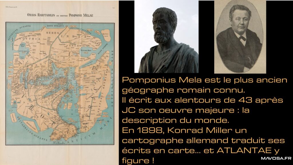 Les archives romaines nous offrent un document exceptionnel daté du 1er siècle après JC. Un certain Pomponius Mela, le plus ancien géographe connu, a produit à cette époque un texte descriptif du monde nommé De Chorographia, une centaine de pages en latin, inspiré d’un héritage grec (Eratosthène, Hipparque, Posidonios).