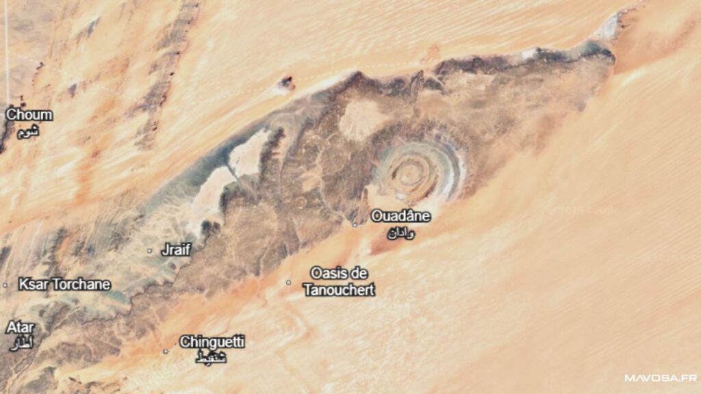 Ou « Œil du Sahara »Située dans la région de l’Adrar, en Mauritanie, à environ 40 km au nord-ouest d’Ouadane, la Structure de Richat (ou Guelb er Richât, littéralement « Cœur des plumes » en hassaniya, ou tagense, référence au puits local) est une formation géologique circulaire spectaculaire de 40 à 50 km de diamètre. Visible uniquement dans son ensemble depuis l’espace, elle est souvent surnommée « Œil de l’Afrique » ou « Eye of the Sahara ».