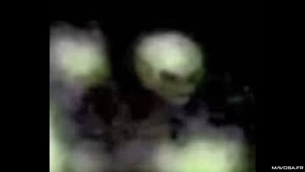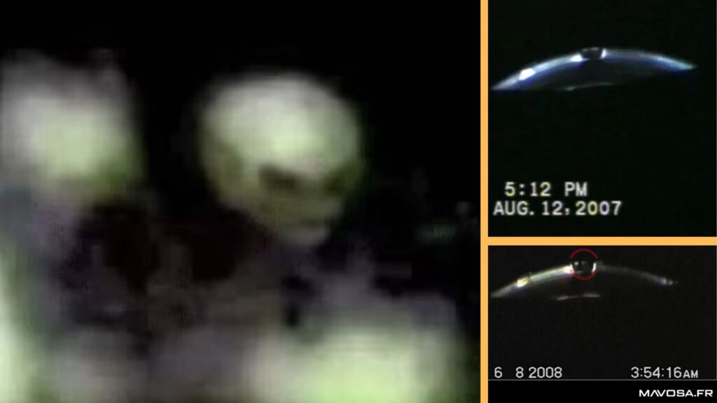 A droite des images extraites des vidéos tournées en 2007 et 2008. A gauche le zoom le plus probant sur les êtres aperçus dans l’engin.