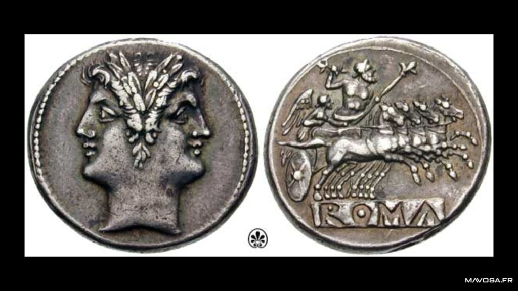 Janus est le Dieu romain à deux visages (ce qui donne l’adjectif janiforme), l’un tourné vers le passé, l’autre tourné vers le futur. Il symbolise la porte, le passage, la transition (janvier : passage à l’année suivante). Janus voit simultanément le passé et le futur, il ne ment pas, ne trompe pas.