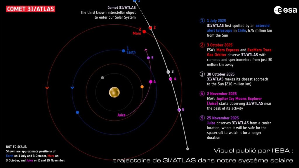 Au cours de l’année 2025, alors que 3I/ATLAS s’approchait de son périhélie (point le plus proche du Soleil, à environ 0,8 UA en janvier 2025), de nouvelles observations ont intensifié les interrogations. Les données collectées par le télescope spatial James Webb (JWST) ont révélé des variations périodiques de luminosité, suggérant une rotation rapide de l’objet, estimée à environ 2 heures par cycle. Cette rotation, combinée à une forme potentiellement allongée (déduite des courbes de lumière), rappelle les caractéristiques de Oumuamua. Plus surprenant encore, des analyses spectroscopiques ont détecté des signatures d’émission inattendues, notamment des raies associées à des molécules organiques complexes, inhabituelles pour un corps naturel à une telle distance du Soleil.