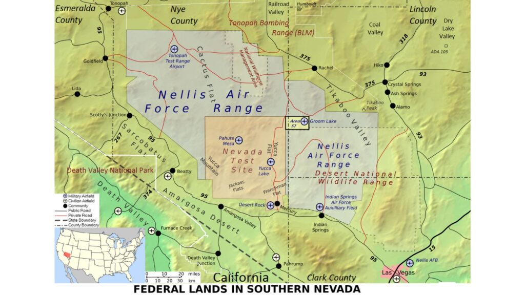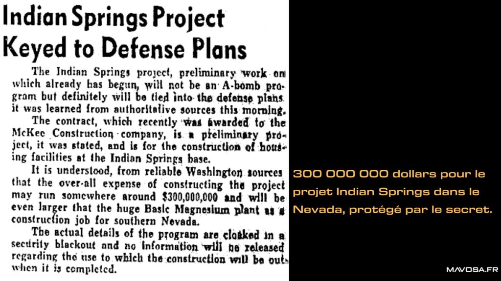 - Le mystère financier datant de 1951 : un projet annoncé pour 300 millions de dollars à Indian Springs n’est couvert que par 680 000 $ de contrats officiels, laissant plus de 299 millions de dollars manquants, suggérant un programme souterrain classifié. Indian Springs est une petite localité désertique située à environ 70 km au nord-ouest de Las Vegas, le long de l’US Route 95. Ce lieu est surtout connu parce qu’il abrite la base militaire Creech Air Force Base, utilisée notamment pour : les opérations de drones de l’US Air Force, l’entraînement et des activités liées aux essais militaires.